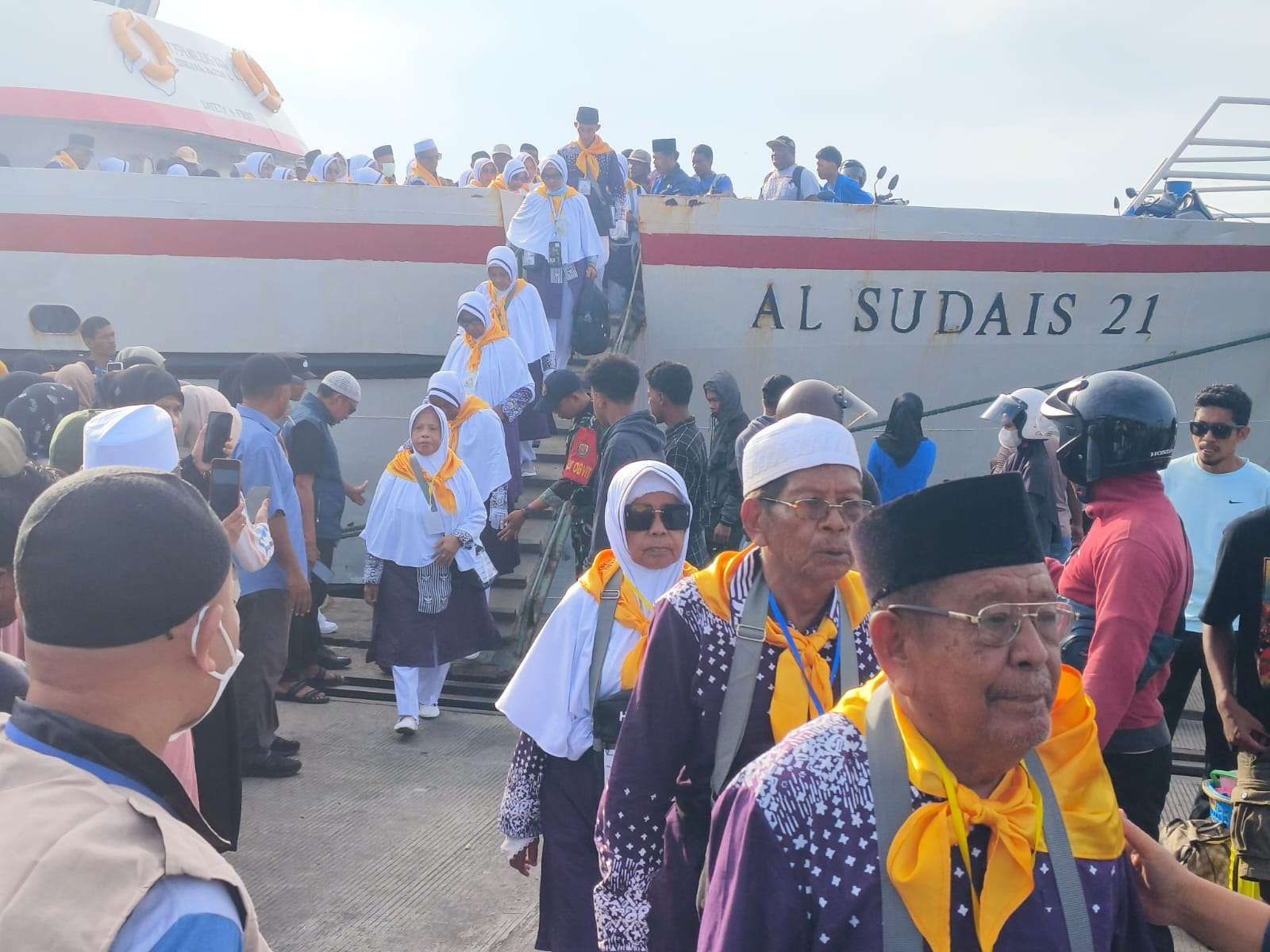Ternate, HarianMalut – Jemaah Calon Haji (JCH) asal Kabupaten Pulau Taliabu sebanyak 47 orang dengan menggunakan KM. Al Sudais tiba di Ternate, Minggu (4/5/2025) selanjutnya para JCH menuju asrama haji transit Ternate.