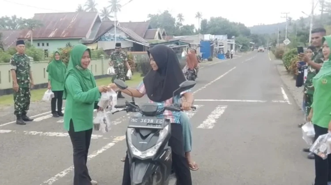 Anggota Koramil bersama ibu-ibu Persit tampak antusias membagikan takjil kepada pengendara sepeda motor maupun mobil yang melintas di depan Makoramil. Para pengguna jalan pun menyambut baik kegiatan tersebut dan mengucapkan terima kasih atas kepedulian yang diberikan.