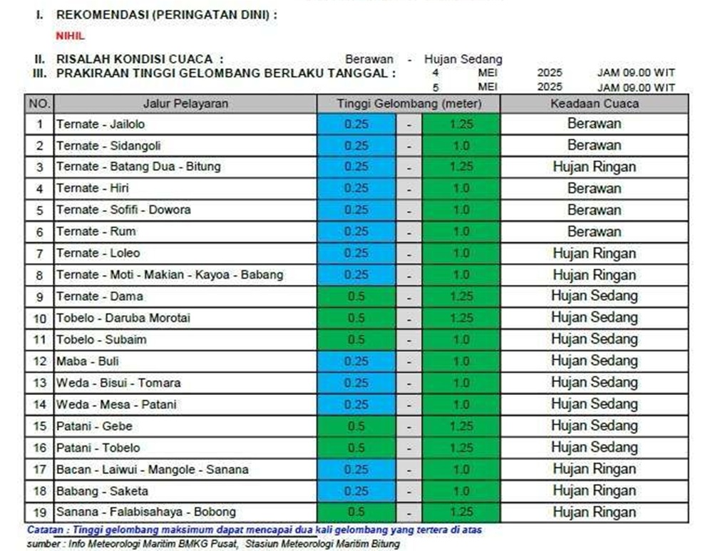 Ia menambahkan bahwa peringatan dini cuaca dengan potensi hujan sedang hingga lebat secara khusus berlaku untuk wilayah Tobelo, Loloda, Jailolo, Ibu, Kao, Oba, Weda, Maba, Wasile, Gane, dan Obi. Ketinggian gelombang laut diperkirakan antara 0,25 hingga 1,25 meter.