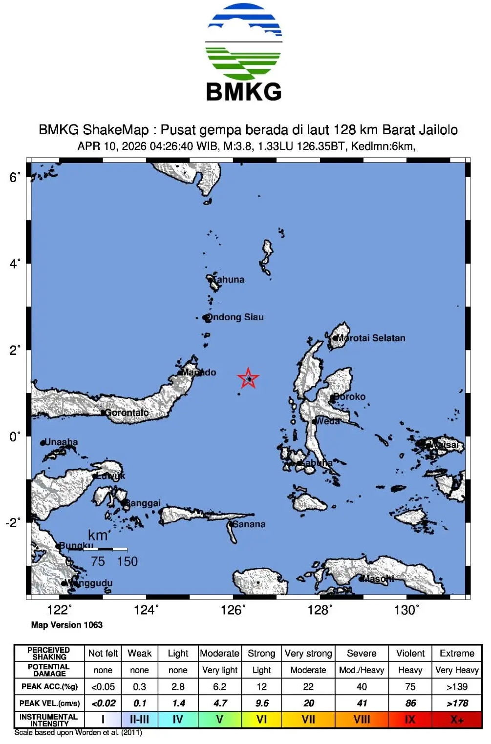 Batang Dua – Gempa bumi tektonik mengguncang wilayah Batang Dua pada Jumat, 10 April 2026 pukul 04.26.40 WIB. Berdasarkan analisis Badan Meteorologi, Klimatologi, dan Geofisika (BMKG), gempa tersebut memiliki magnitudo 3,8 dengan episenter di koordinat 1,33° LU dan 126,35° BT.