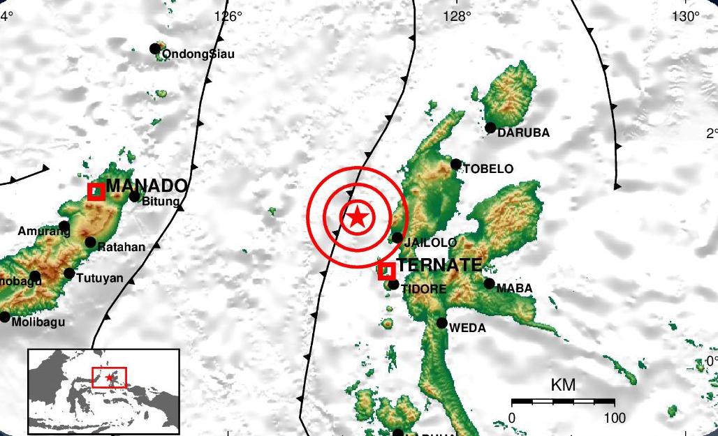 Berdasarkan informasi dari akun Badan Meteorologi, Klimatologi, dan Geofisika (BMKG) lokasi gempa pada koordinat 1.42 lintang utara. Atau 126.42 bujur timur.