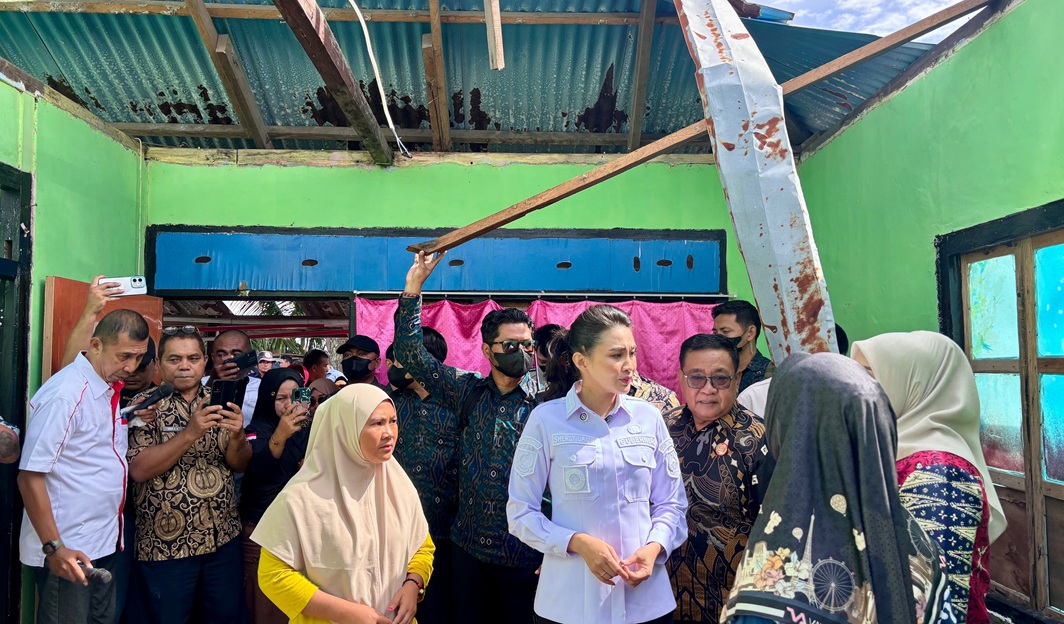 Dalam kunjungannya, Gubernur menyempatkan diri melihat langsung kondisi rumah milik Suryani Kabir yang mengalami kerusakan pada bagian atap akibat diterjang angin kencang.