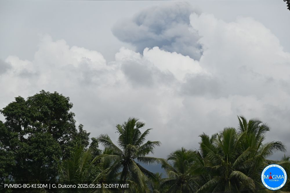 HarianMalut, Halut – Gunung Dukono di Halmahera Utara, Maluku Utara erupsi, Senin (26/5/2025) pukul 12.57 WIT. Tinggi kolom letusan terpantau sekitar 800 meter di atas puncak.