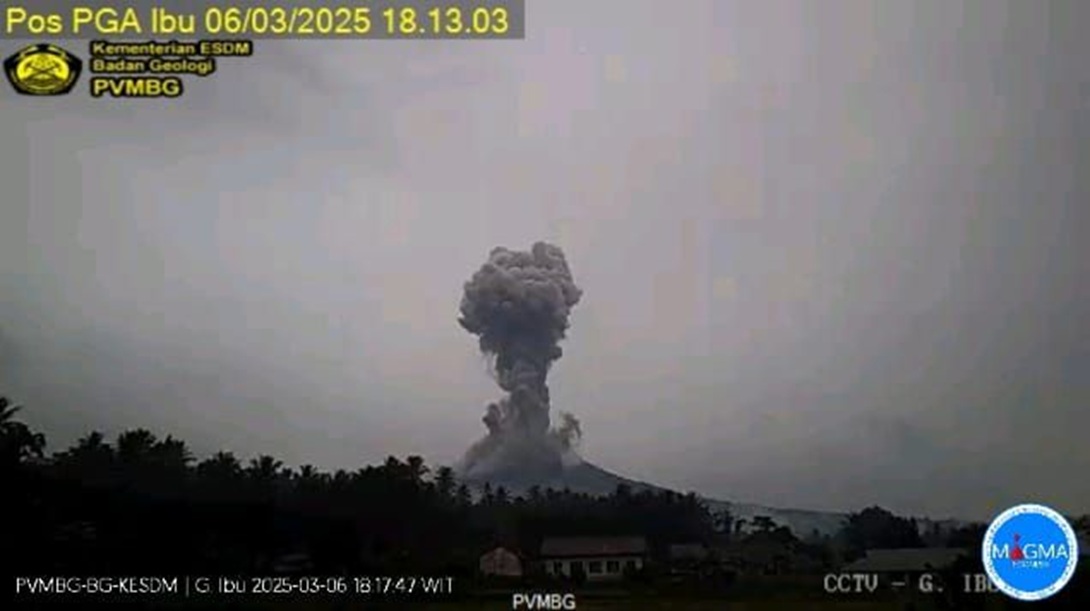 Ibu Selatan, HarianMalut – Gunung api Ibu di Kabupaten Halmahera Barat, Maluku Utara kembali mengalami erupsi pada Kamis, 06 Maret 2025, pukul 18:09 WIT.