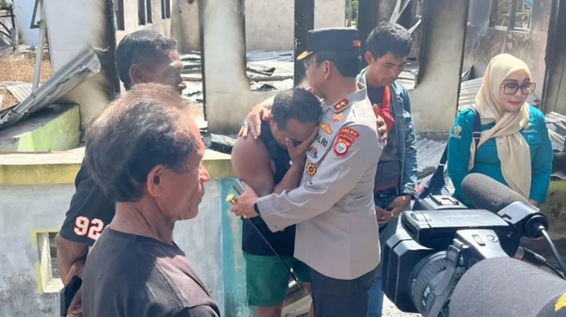 Di satu sisi, suasana haru tak terbendung saat Kapolda memeluk seorang warga yang menangis di tengah puing bangunan yang hangus terbakar. Warga tersebut tampak menunduk, larut dalam kesedihan, sementara Kapolda menenangkan diri dengan pelukan hangat, sebuah gambaran nyata luka yang ditinggalkan konflik.