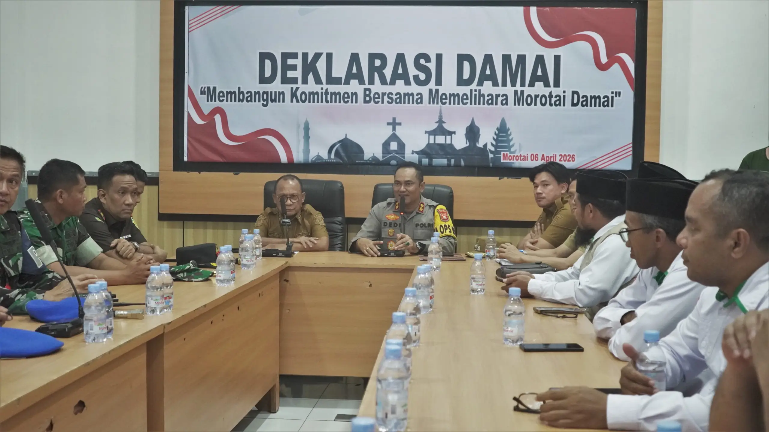 Morotai – Pemerintah Kabupaten Pulau Morotai bersama unsur Forkopimda, tokoh agama, dan tokoh masyarakat menggelar rapat deklarasi damai guna memperkuat komitmen menjaga keamanan dan ketertiban masyarakat (Kamtibmas). Kegiatan berlangsung di aula Polres Pulau Morotai, Desa Daruba, Kecamatan Morotai Selatan, Senin 6 April 2026.