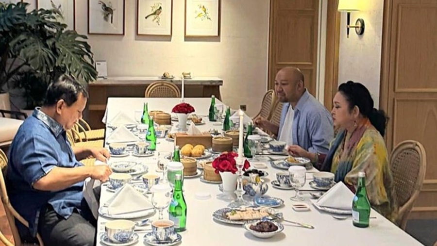Di hadapan mereka, tersaji berbagai makanan dan minuman di meja. Presidrn duduk di satu sisi, sementara Titiek dan Didit berada di sisi hadapannya.