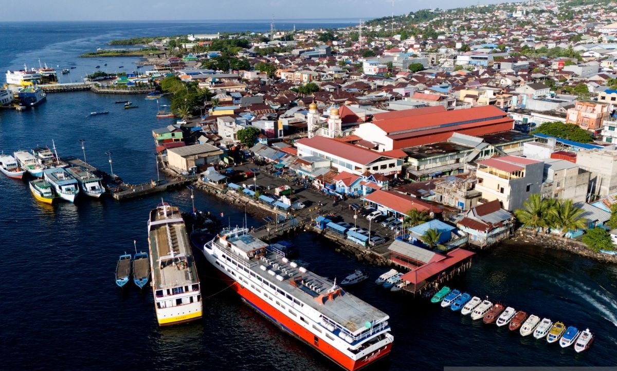 Foto dari udara sejumlah kapal penumpang sedang berkatifitas penyeberangan antarpulau di Pelabuhan Bastiong, Ternate, Maluku Utara, Minggu (16/3/2025). Pelabuhan ini merupakan salah satu pelabuhan tersibuk di Kota Ternate karena memiliki peran yang sangat penting dalam mendukung distribusi barang ke berbagai wilayah di Maluku Utara dengan memudahkan mobilitas masyarakat yang menggunakan jasa transportasi antarpulau. (Foto: ANT/HM)