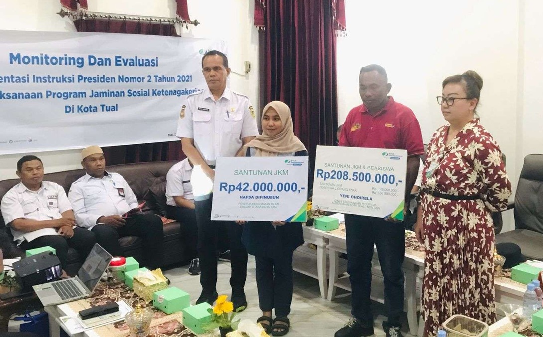 Didalam kegiatan tersebut Pj Sekda Kota Tual menyerahkan secara simbolis santunan dari BPJS Ketenagakerjaan kepada 2 ahli waris, yang mana kepesertaan tersebut berasal dari pemerintah kota tual yaitu ahliwaris dari non asn dinas lingkungan hidup menerima santunan kematian dan manfaat beasiswa sebesar Rp 208.500.000 dan ahliwaris dari pekerja keagamaan menerima santunan kematian sebesar Rp 42.000.000.